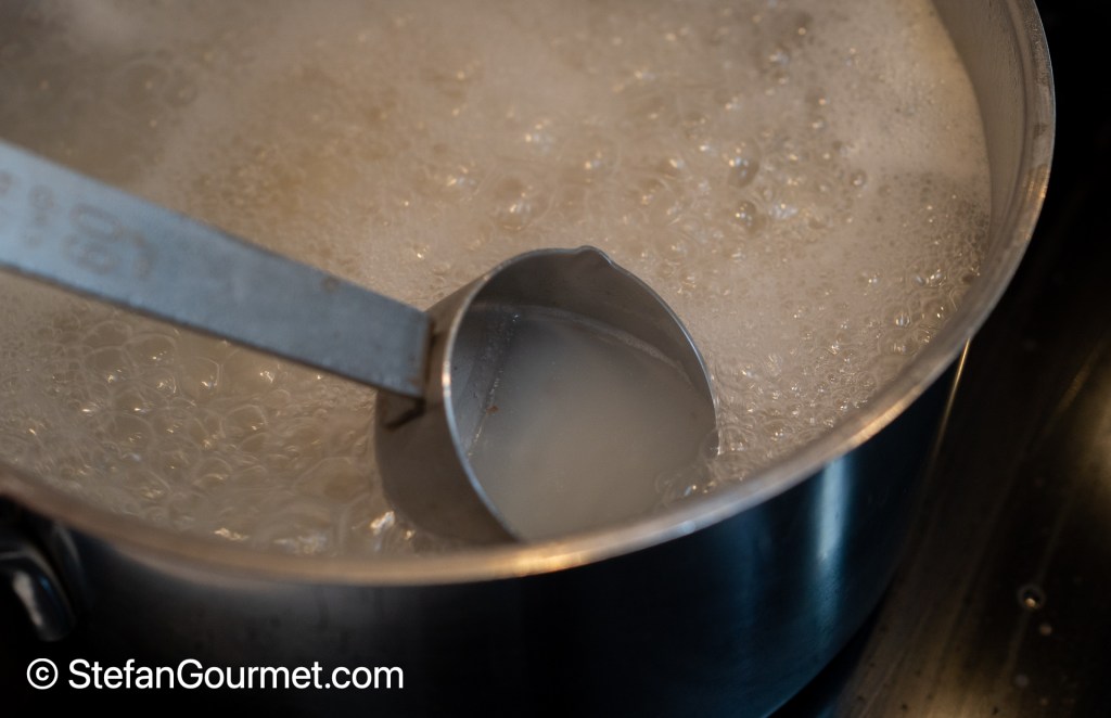 After turning the celeriac, bring a pot of water to a boil. When the water boils, add salt and the penne. Set the time for al dente as indicated on the package. Scoop out about 60 ml (1/4 cup) of the pasta cooking water towards the end of the cooking.