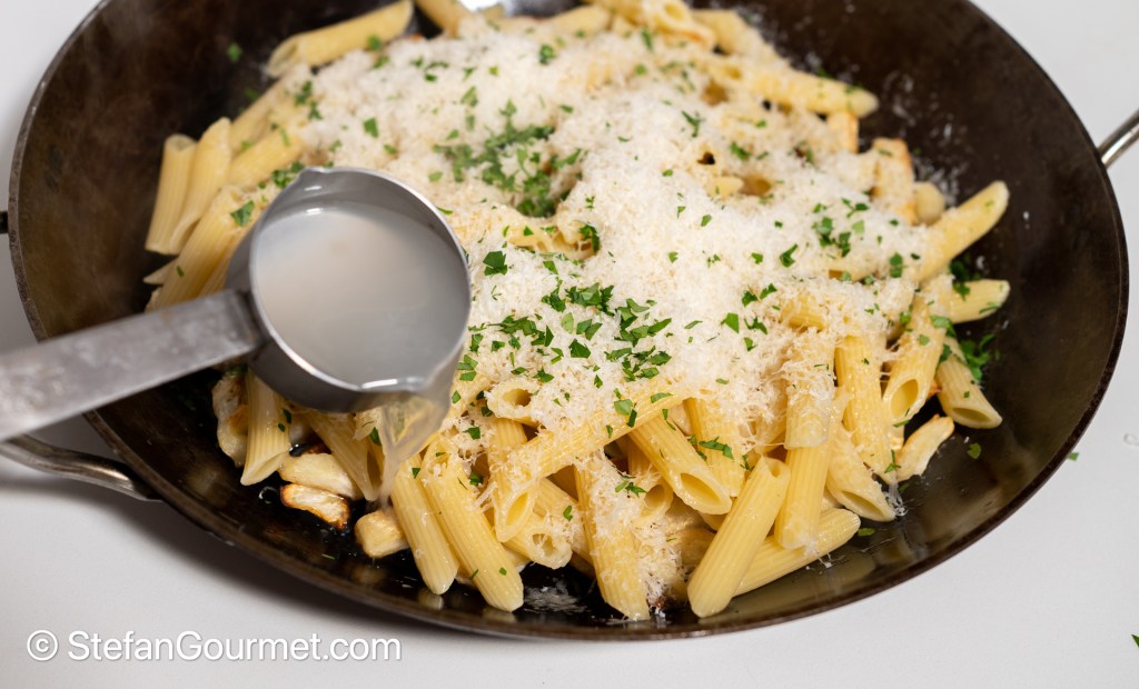 Drain the pasta and add it to the celeriac, together with 30 grams of freshly grated parmigiano and most of the minced parsley. Add a few tablespoons of the reserved cooking water as well.