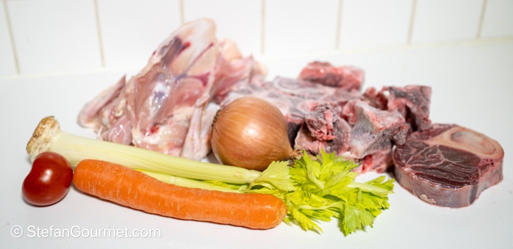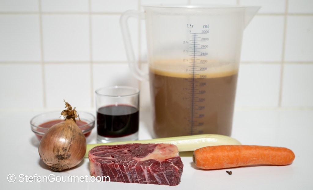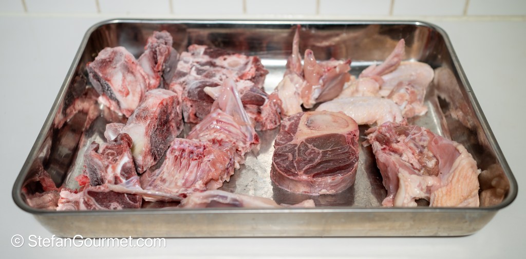 Place the beef shin, beef bones, and chicken carcass in a roasting tray…