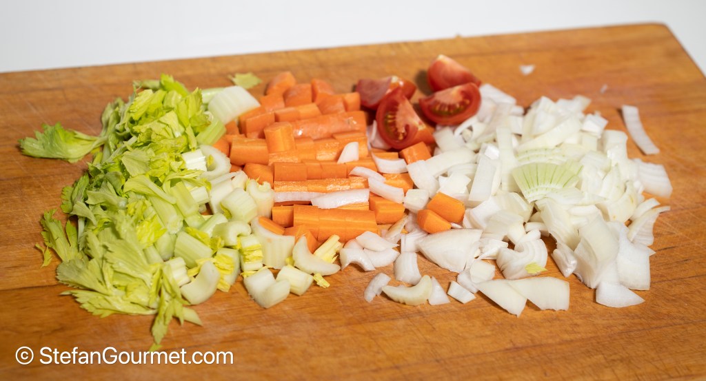 1 onion, 1 carrot, 1 celery stalk, 1 tomato, all chopped