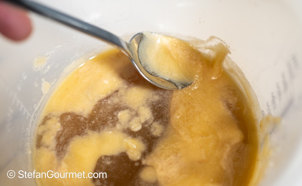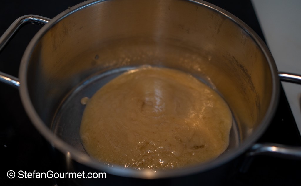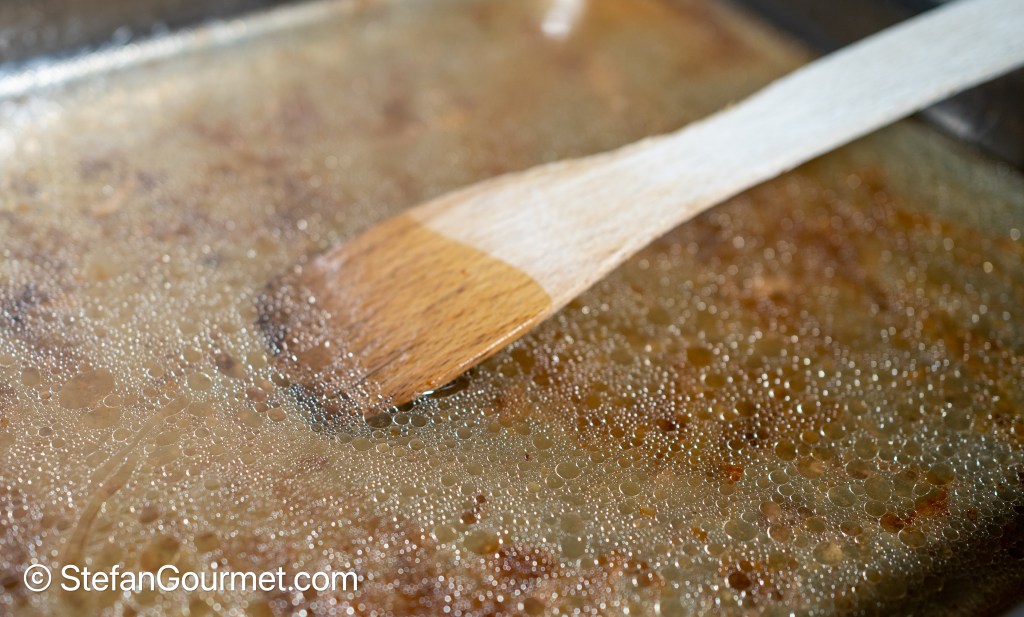 Stir over medium heat until most remaining water has evaporated from the fat (which you can tell by the size of the bubbles and it will start to darken in color).