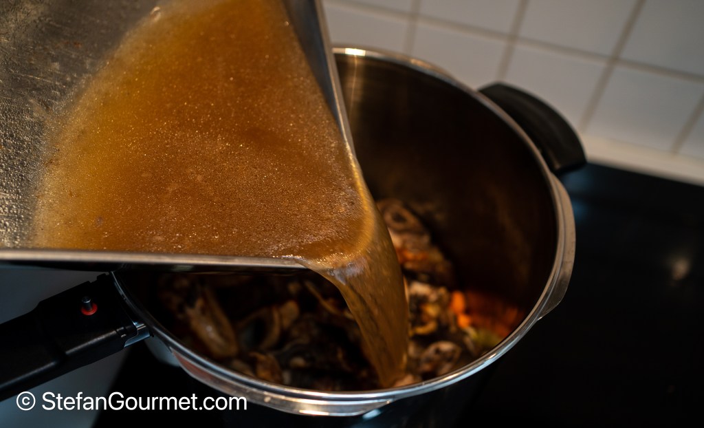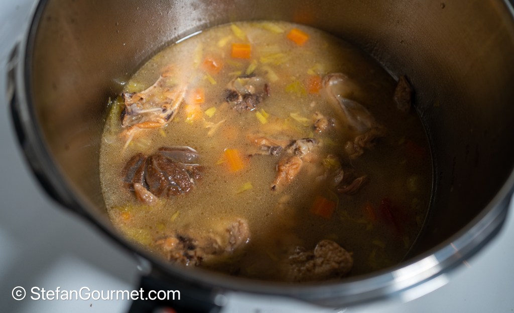 Place the chopped vegetables and the roasted meat and bones in a stockpot or pressure cooker. Add boiling water to the roasting tray, and scrape with a wooden spatula to get all of the flavor into the water.