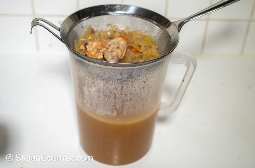 Spoon off the fat that will float on top of the broth, which is easier after the broth has cooled off.
