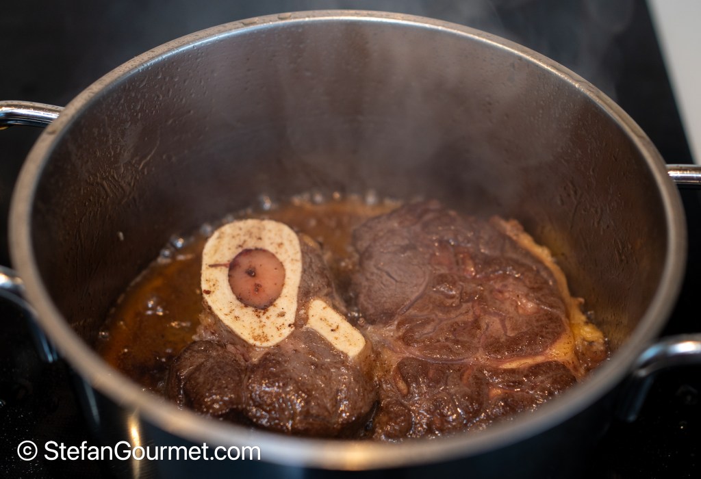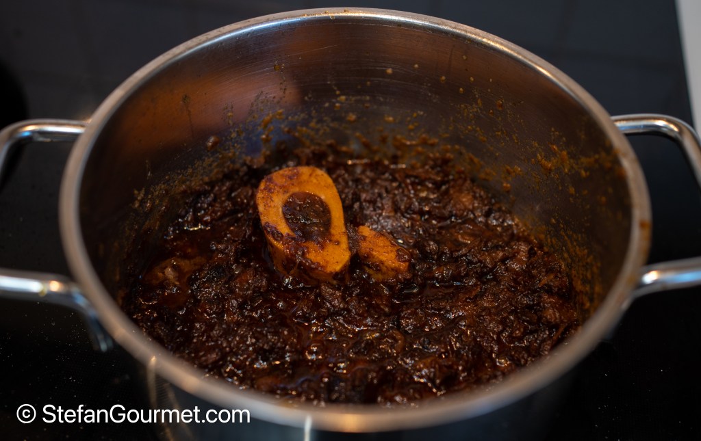 When it is done, remove the bone, but scoop the marrow out of the bone and add it to the stracotto. The stracotto can be prepared in advance and stored in the refrigerator.