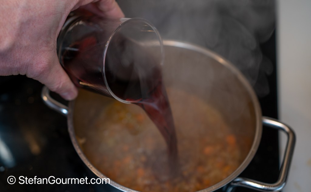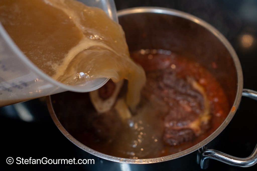Brown the beef shin in this fat on both sides, then take it out of the pot, and reserve.