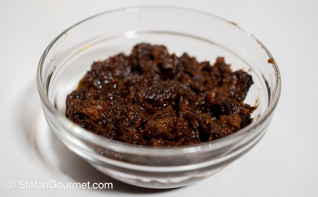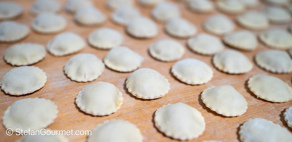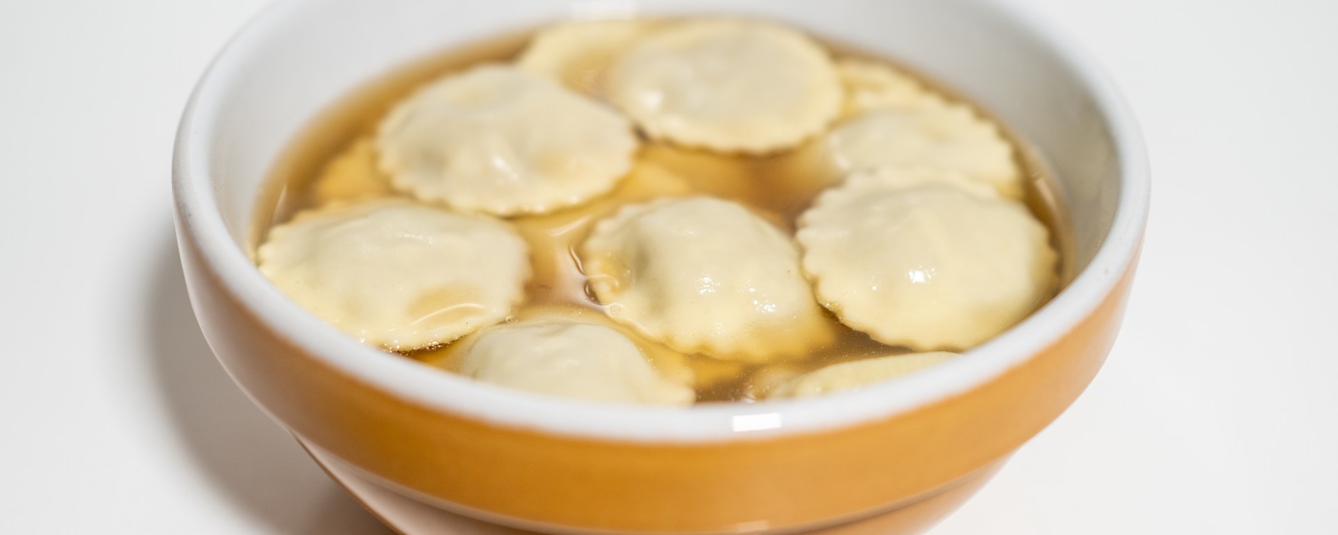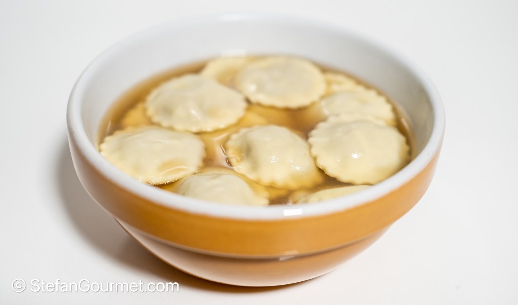 Anolini in brodo is a typical dish from the region of Parma that intrigued me when I enjoyed it at Locanda Mariella. The small round ravioli are filled with stale bread that is soaked in meat jus. The result is a tasty meaty flavor but with a lighter texture that is very pleasant. The ravioli are served in a meath broth (brodo di carne). The nice thing about this recipe is that it can be made from leftover meat scraps, bones, and stale bread. So it is a poor man’s festive dish, but tastes great! As always with traditional Italian recipes, there are countless variations. I have made the filling with stracotto of beef shin that I prepared on purpose, but you could certainly prepare this with leftover jus from a roast instead. This was our primo piatto for Christmas.