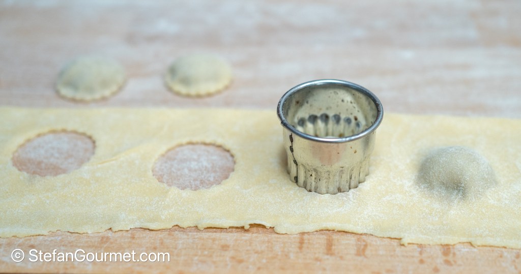 Use a circular cutter with a diameter of about 3 cm (1 1/4 inch) to cut out the anolini. In Italy this is also done with a special tool.