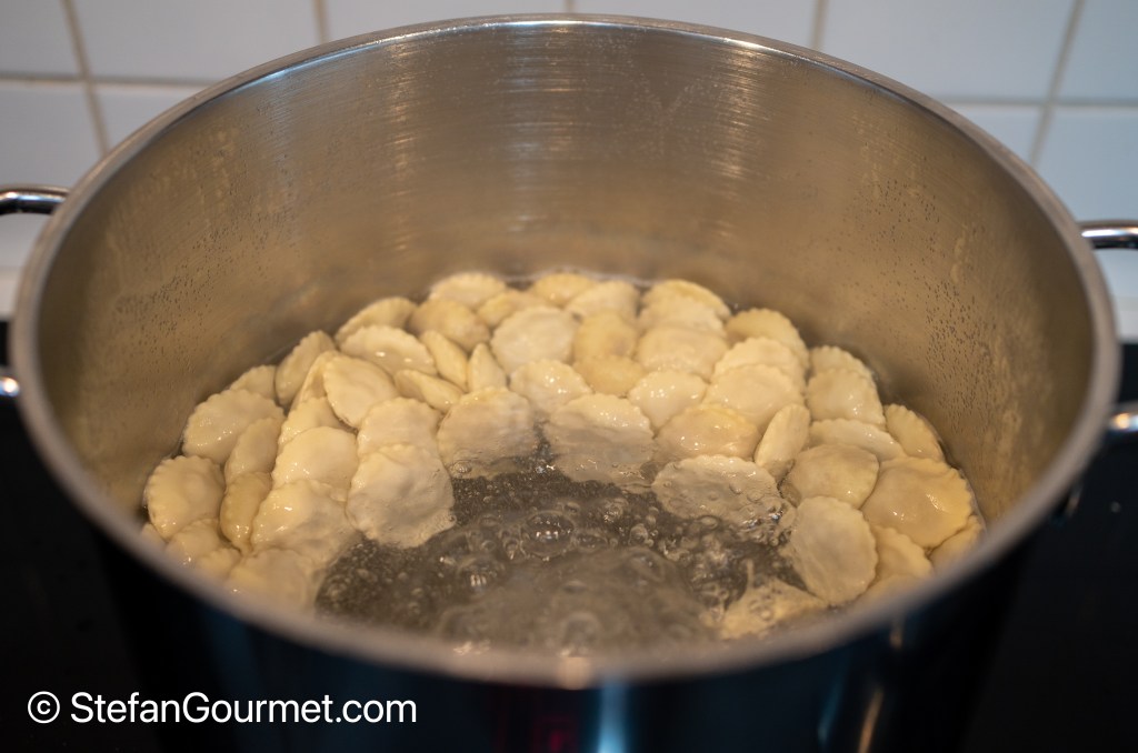 Boil the anolini in salted water for about 3 minutes. You could also boil the anolini in the broth, but that will make the broth cloudy.