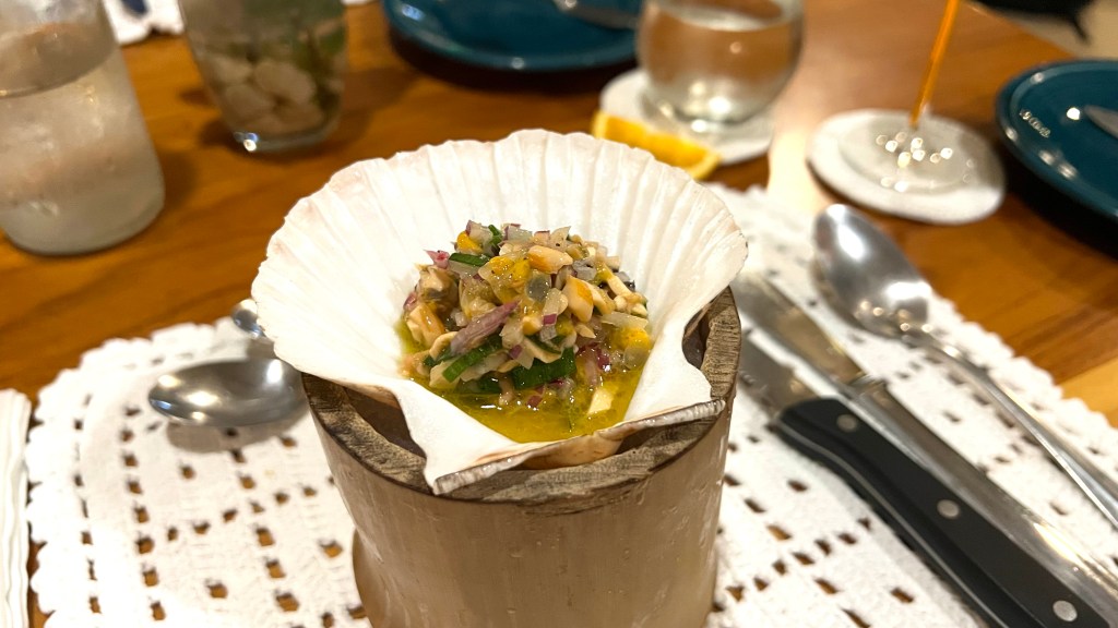 The first course is mussel ceviche with passion fruit. It has a very nice flavor and texture, and is paired nicely with a Cava Reserva from Spain. The passion fruit pits add an interesting textural element, that could be mistaken for a small piece of mussel shell. I am not sure if that was an intended effect.