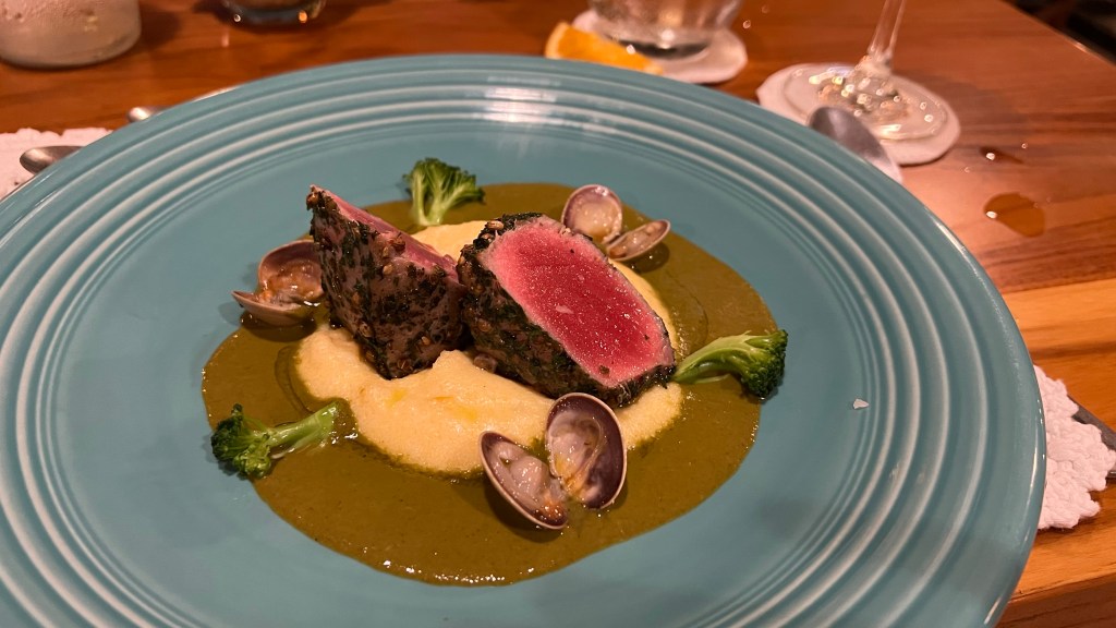 The third course was seared tuna with a crust of fennel seed and coriander seed, with a kale coulis, and polenta, paired excellently with an oaked Pinot Grigio from Veneto. I usually don’t care so much for polenta, but this was a very nice combination. The tuna was delicious and worked very well with the wine.