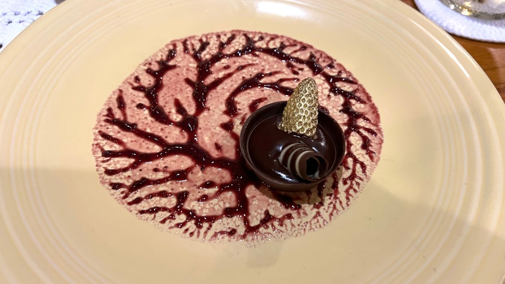 Unfortunately I forgot to take a photo of the fourth course. It was fillet mignon with a chocolate and citrus sauce with mashed sweet potato, paired well with a Cabernet Sauvignon from Israel. The beef was good and the sauce very elegant, with only hints of chocolate and citrus. The Cabernet was quite elegant as well and therefore worked well with the citrus in the sauce.