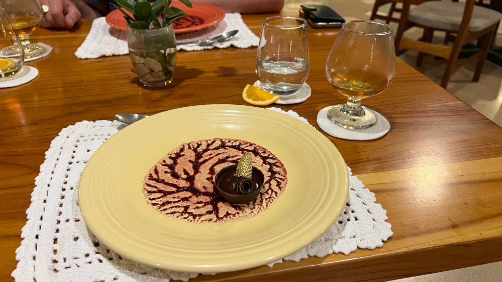 This came with a glass of uchua liquor from Copey de Dota in Costa Rica. Uchua is Spanish for goldenberry or physalis. This is a unique drink from Costa Rica that was a very good pairing with the dessert. Sweet enough but also fresh enough.