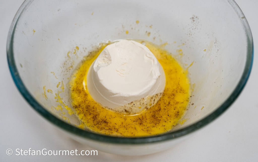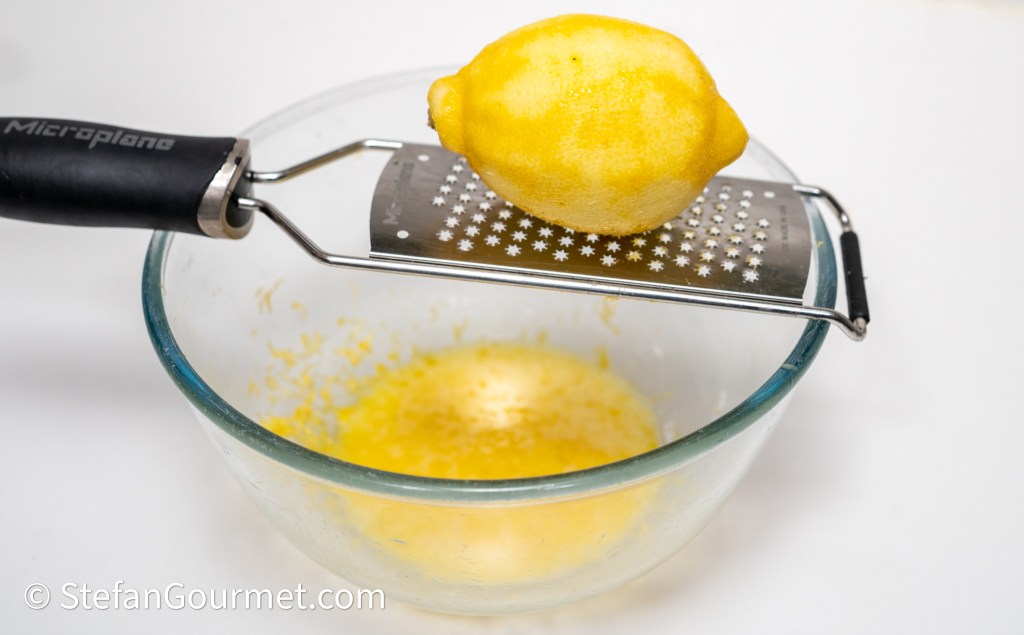 Beat an egg in a large bowl and add the grated zest of a lemon.