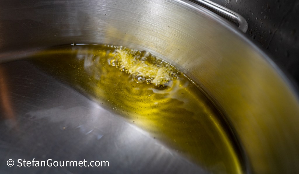 Heat 2 tablespoons of olive oil in a frying pan. Add a thickly sliced garlic clove and tilt the pan to deep fry the garlic in the oil. Discard the garlic as soon as it turns golden.