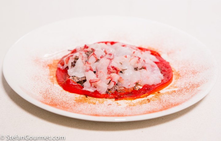 One of the most original and best new dishes I’ve had in a Michelin starred restaurant over the last years was “Raw carabinero prawn on crispy strands of short rib (‘pulled’ short ribs, then deep fried) with roasted bell pepper, ginger, water melon, and X.O. cream”. My version is not as good as at the restaurant, but quite good indeed.