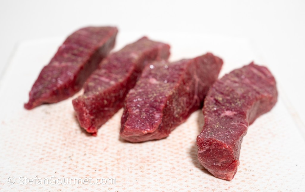 Slice the beef in steaks of about 2.5 centimeters/1 inch thick and then in long strips of the same width. Season them with salt and freshly ground black pepper on all sides.