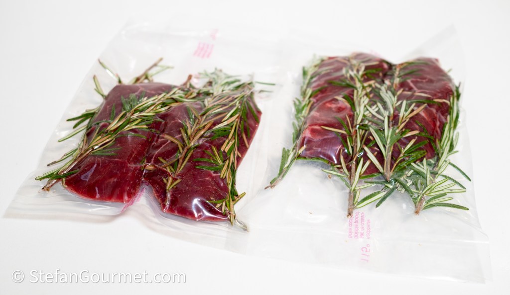 Vacuum seal the beef with fresh rosemary sprigs, spreading out the rosemary such that all sides are covered.