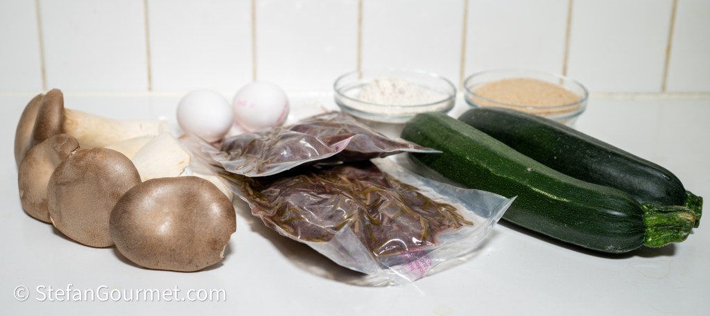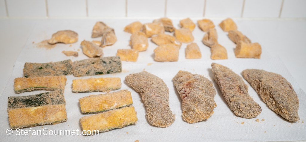 Repeat this with the other pieces of beef. Cut the mushrooms and zucchini into large chunks, and bread them in the same way as the beef.