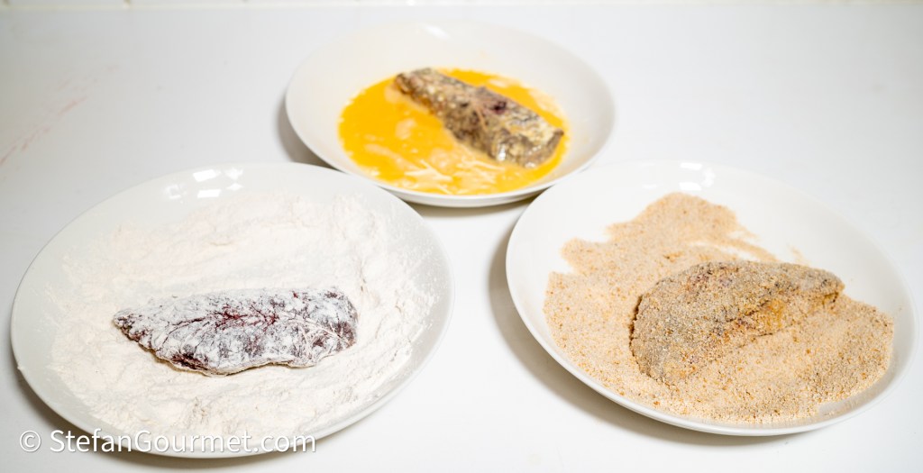 Set up a breading line. First dust each piece of beef in flour, making sure it is completely covered and shaking off any excess. Then dip the floured beef in beaten egg. Finally, cover the beef with bread crumbs, again making sure it is completely covered and shaking off excess.