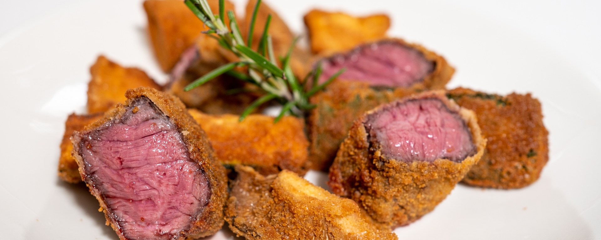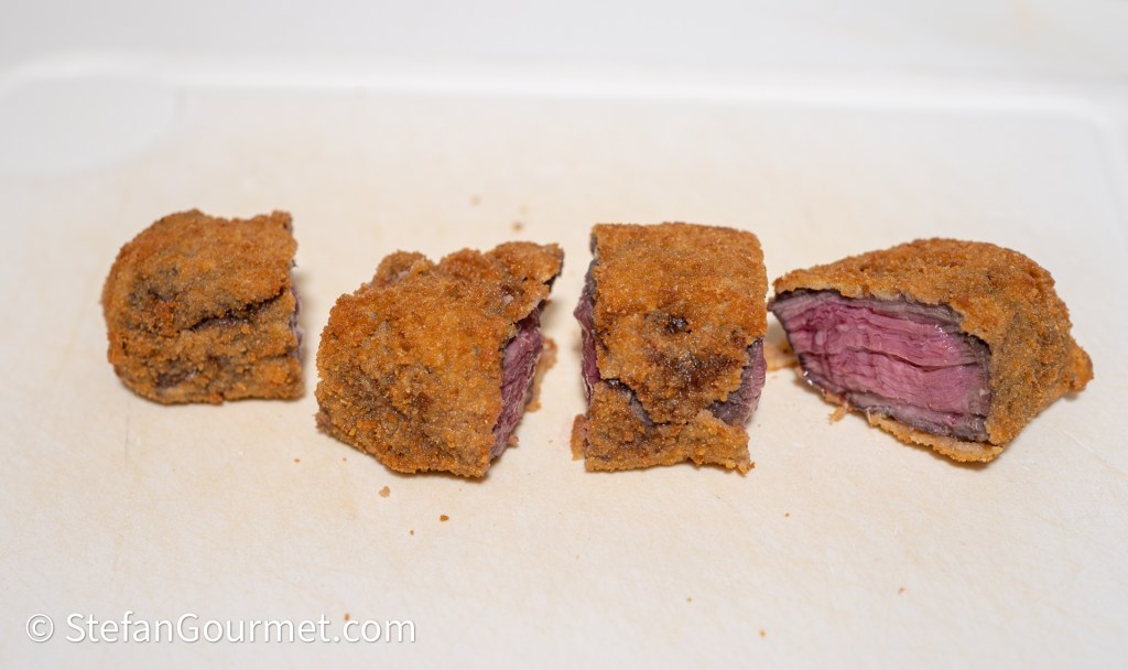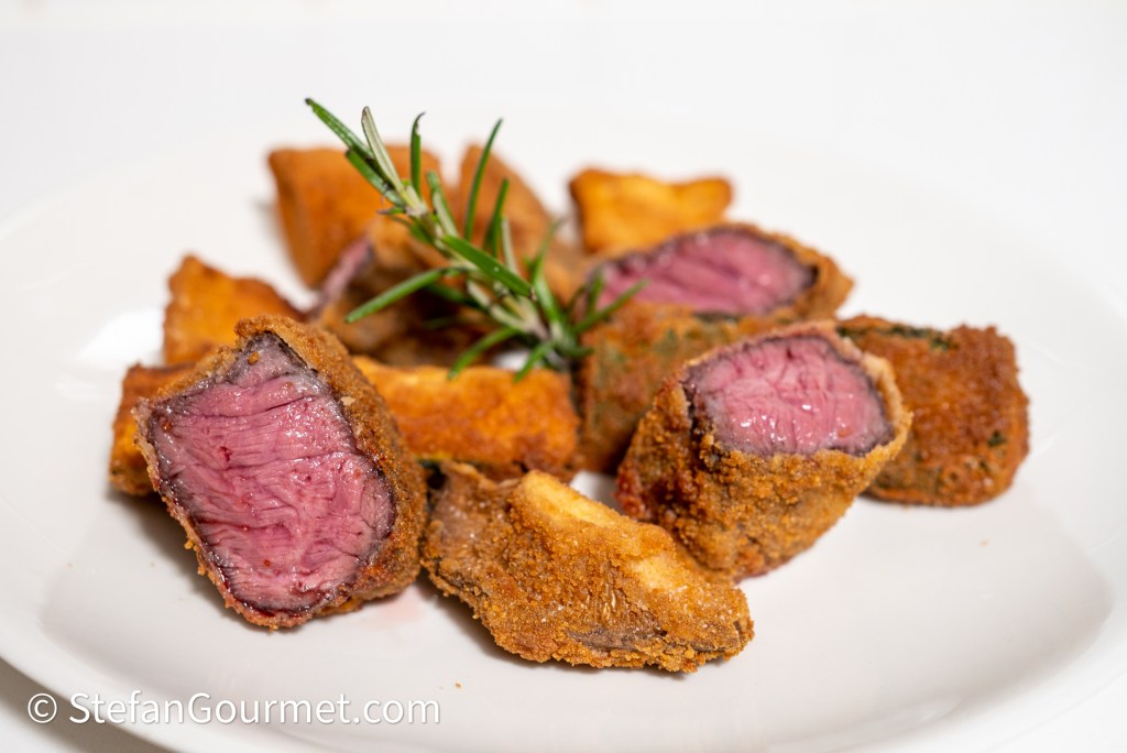 In classic Italian preparations the beef is deep fried when it is still raw, but precooking the beef sous vide has some advantages. By chilling the beef after sous vide cooking and then deep frying, the correct doneness of the beef is assured. The deep frying only serves to create the crispy outside and to bring the inside to serving temperature. When deep frying raw beef, it is more difficult to avoid undercooking or overcooking the beef at the same time as achieving a crispy golden brown crust. Another advantage is that the beef will already release the juices that will be released in any case by cooking the beef, which means that less juices will be escaping during and after frying the beef, thus keeping the crust more crispy. And finally, including some fresh rosemary in the pouch adds a very nice touch of rosemary to the beef.