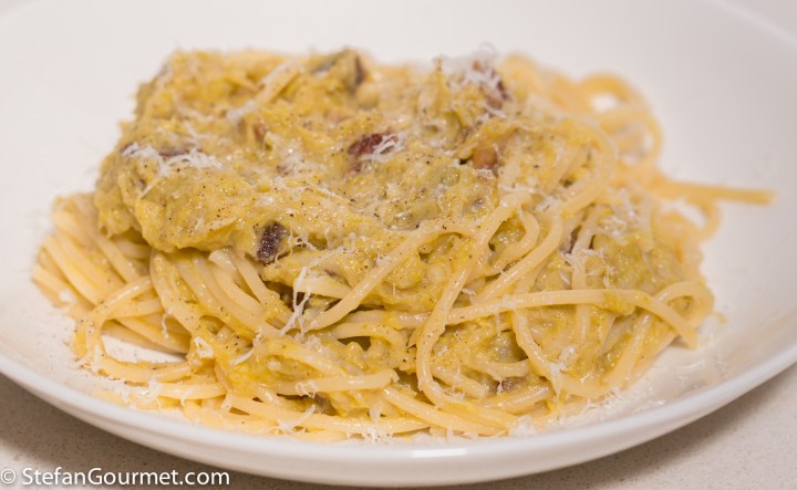 Spaghetti with sous vide leeks and pancetta is a wonderful pasta dish of my own creation.