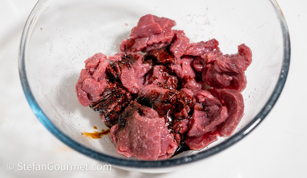 Add 1 tsp of cornstarch and 1 tsp of cooking oil, stir to mix. Allow to marinate for 30 minutes.