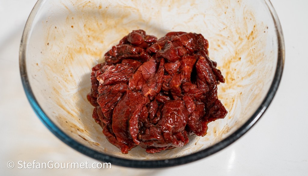 When the beef has finished marinating, heat an ample amount of cooking oil in a wok (at least 2.5 centimeters or 1 inch deep) to 160C/320F. Add 1/2 teaspoon of cooking oil to the beef and stir; this is to prevent the beef from sticking together when it is added to the oil. When the oil is hot, add the beef and stir for 10 seconds only.