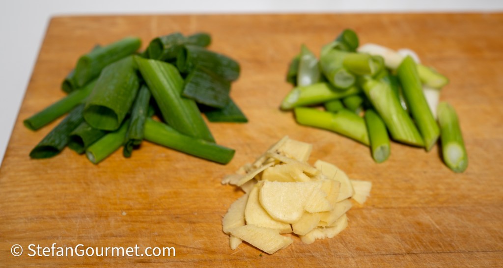 In the meantime, cut the scallions into pieces of 5 cm (2 inches) and separate the white and green part. Slice the ginger thinly.