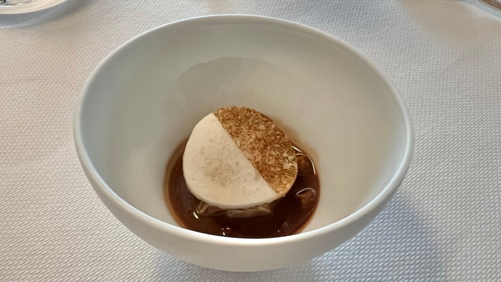 This was paired with the chef’s signature dish: foie gras with a balsamic emulsion. The pairing wasn’t terrible, but it wasn’t very good either. The dish is very original and very nice.