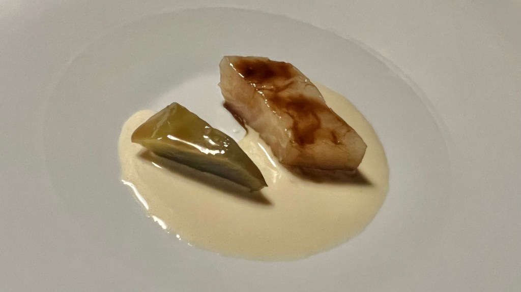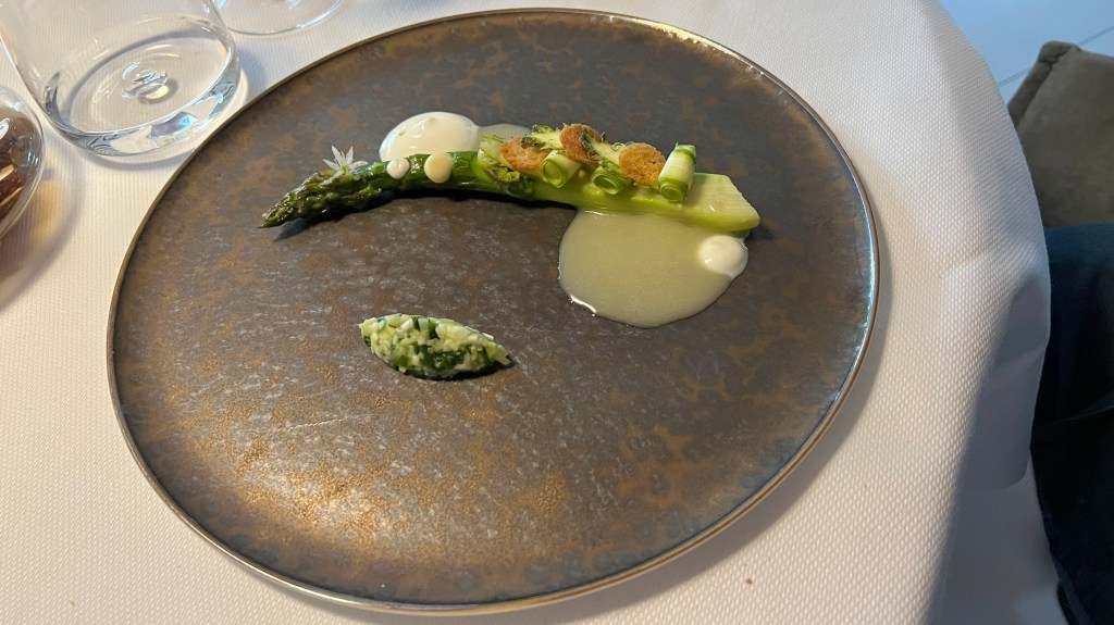 As a pairing it did not make any sense with the green asparagus that was served with parmigiano croutons, a lemon sauce, and a pistachio emulsion (not on the photo). The wine was too strong for the dish and the dish did not reduce the acidity of the wine. The green asparagus was barbecued so lightly that there was no barbecue flavor.