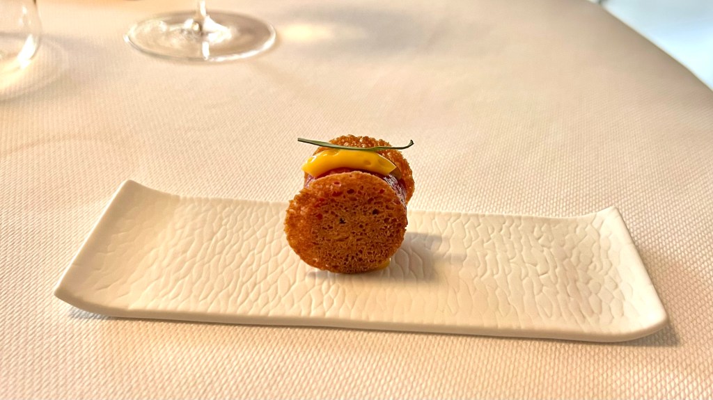 The snail with garlic and parsley was served inside a croquette; the garlic was very strong. This is the way snails are usually served in France, but for an amuse bouche it was a bit hefty. There was also some ox tongue with eggless mayonnaise.