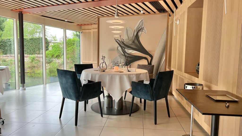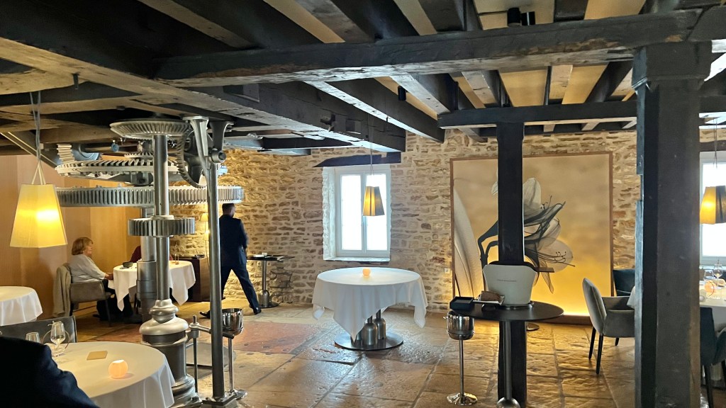 The restaurant is located in an old water mill. We opted for the “Mon Univers” degustation (8 courses for 150 euros) with wine pairing (108 euros for 7 glasses).