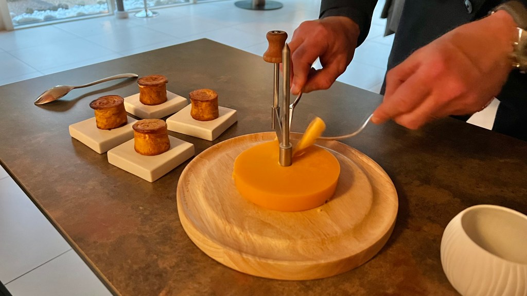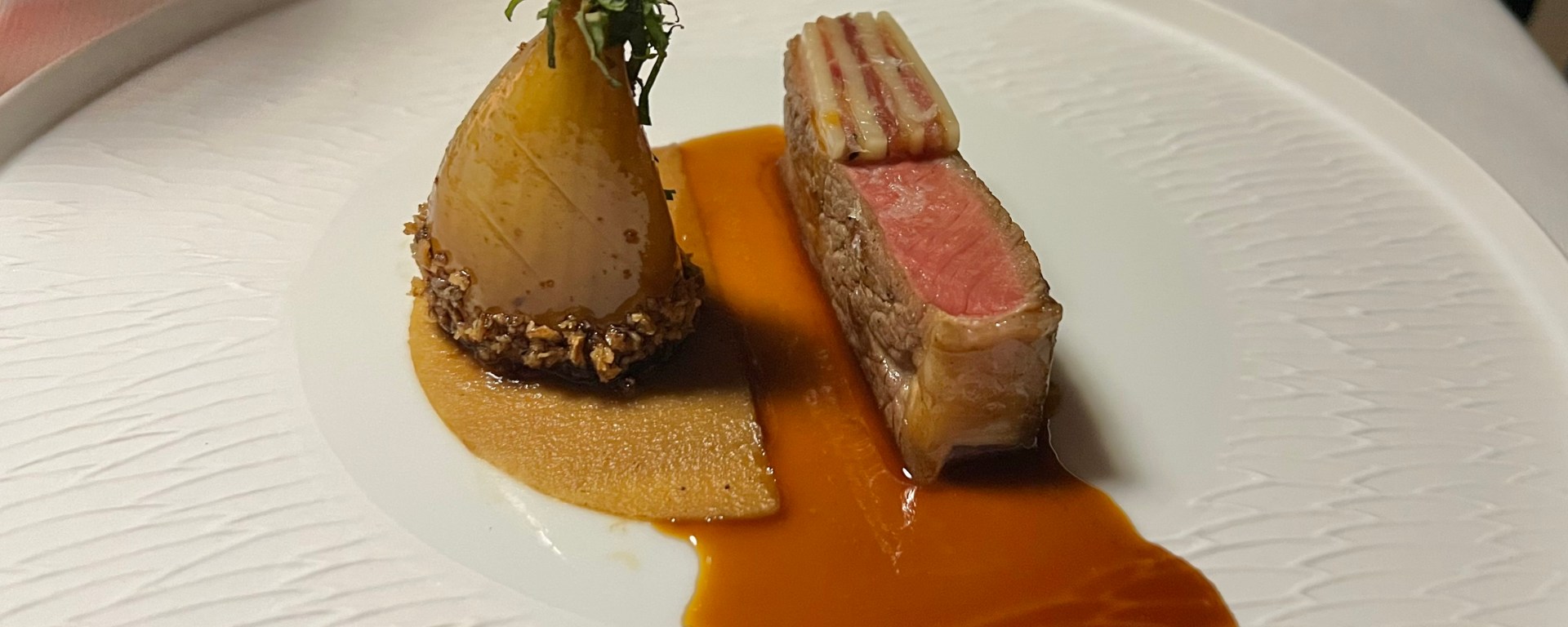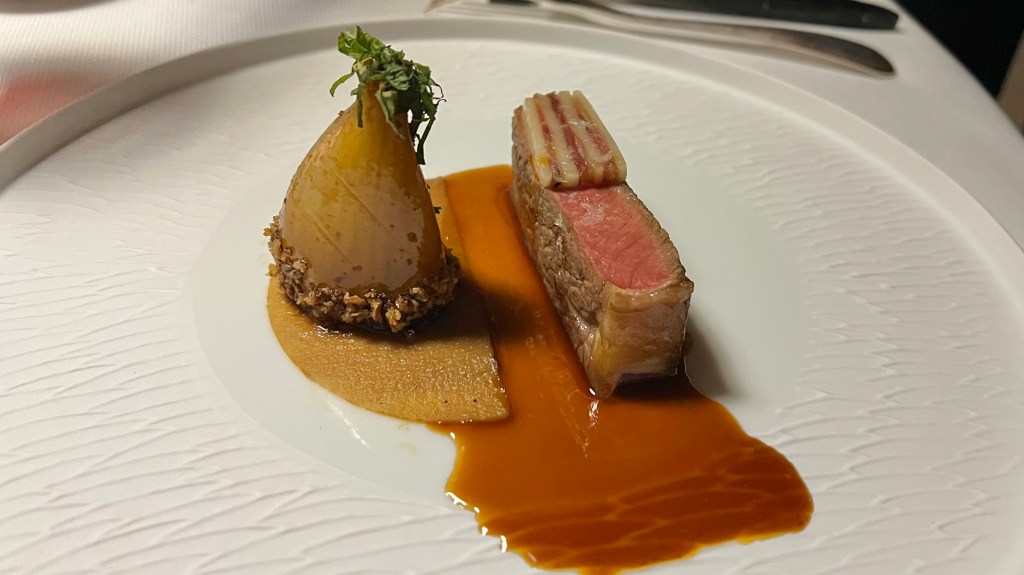 It was a good pairing with a strip steak of Charolais beef, served with a marbré of Comté cheese and cured ham, a slowcooked shallot, and a beef jus.