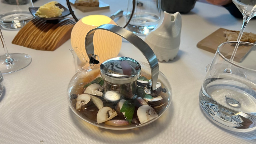 An infusion with mushrooms, shallots, and coffee beans had been infusing on our table for a while. It was used for the next dish: