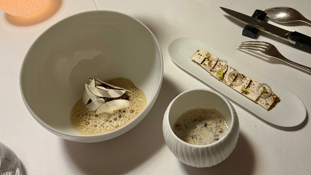Mushroom cappuccino, a cracker with raw mushroom and hazelnuts, and caramelized shallots with more hazelnut and raw mushrooms. The caramelized shallots were very sweet and a very strong flavor compared to the very light-flavored raw mushrooms, so this dish didn’t really work for me.