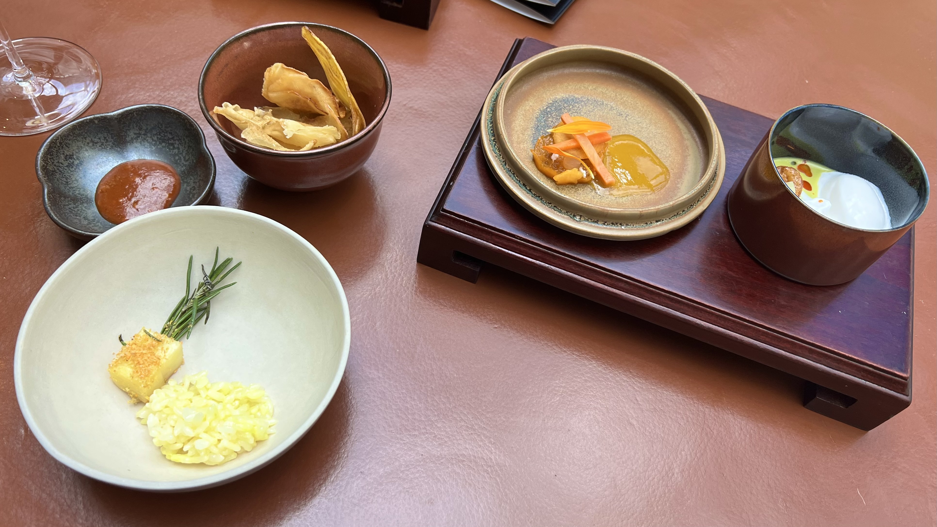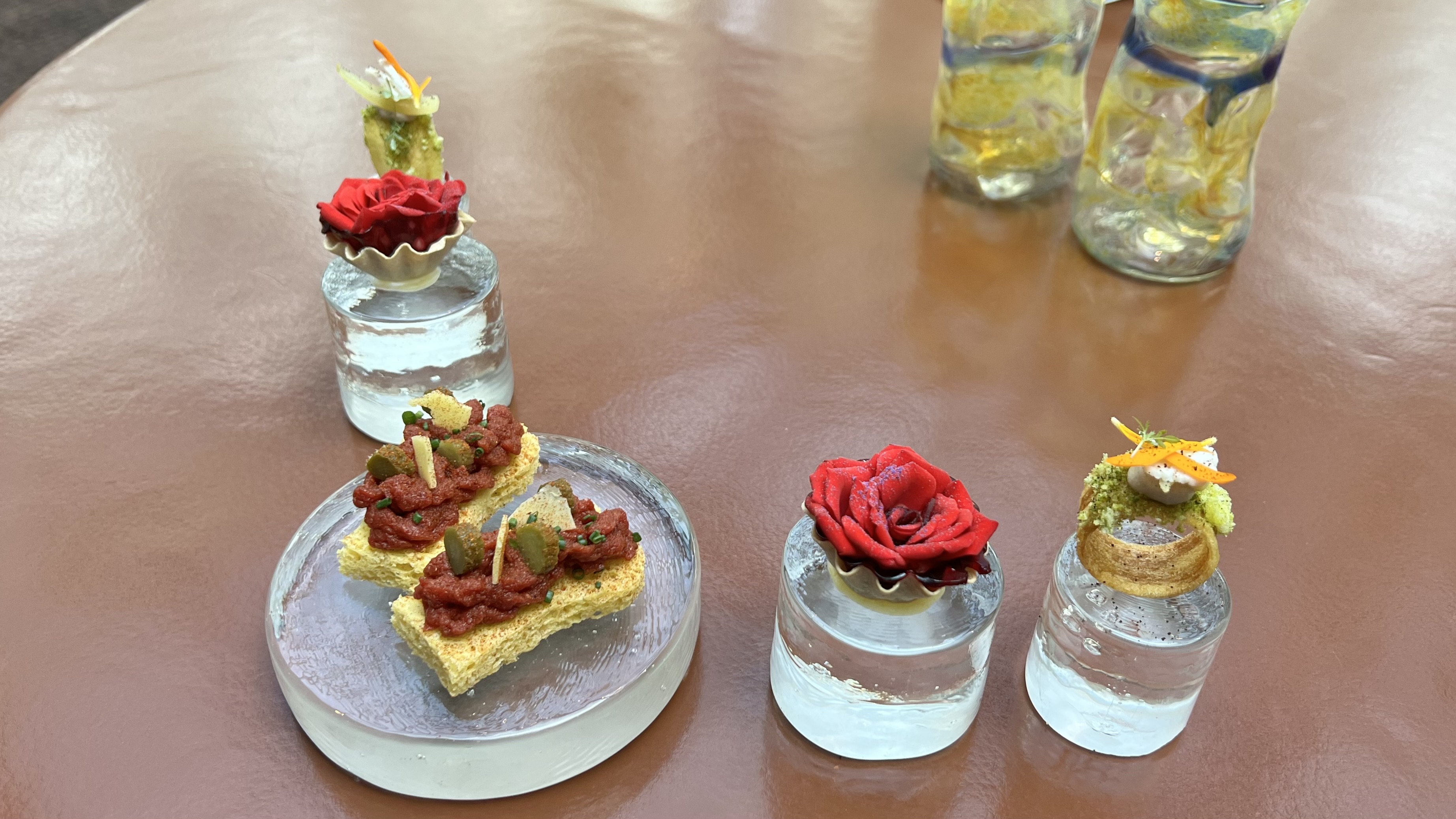 The first set of amuse bouche: a cauliflower ring, an edible rose, and tartare with curry spices.