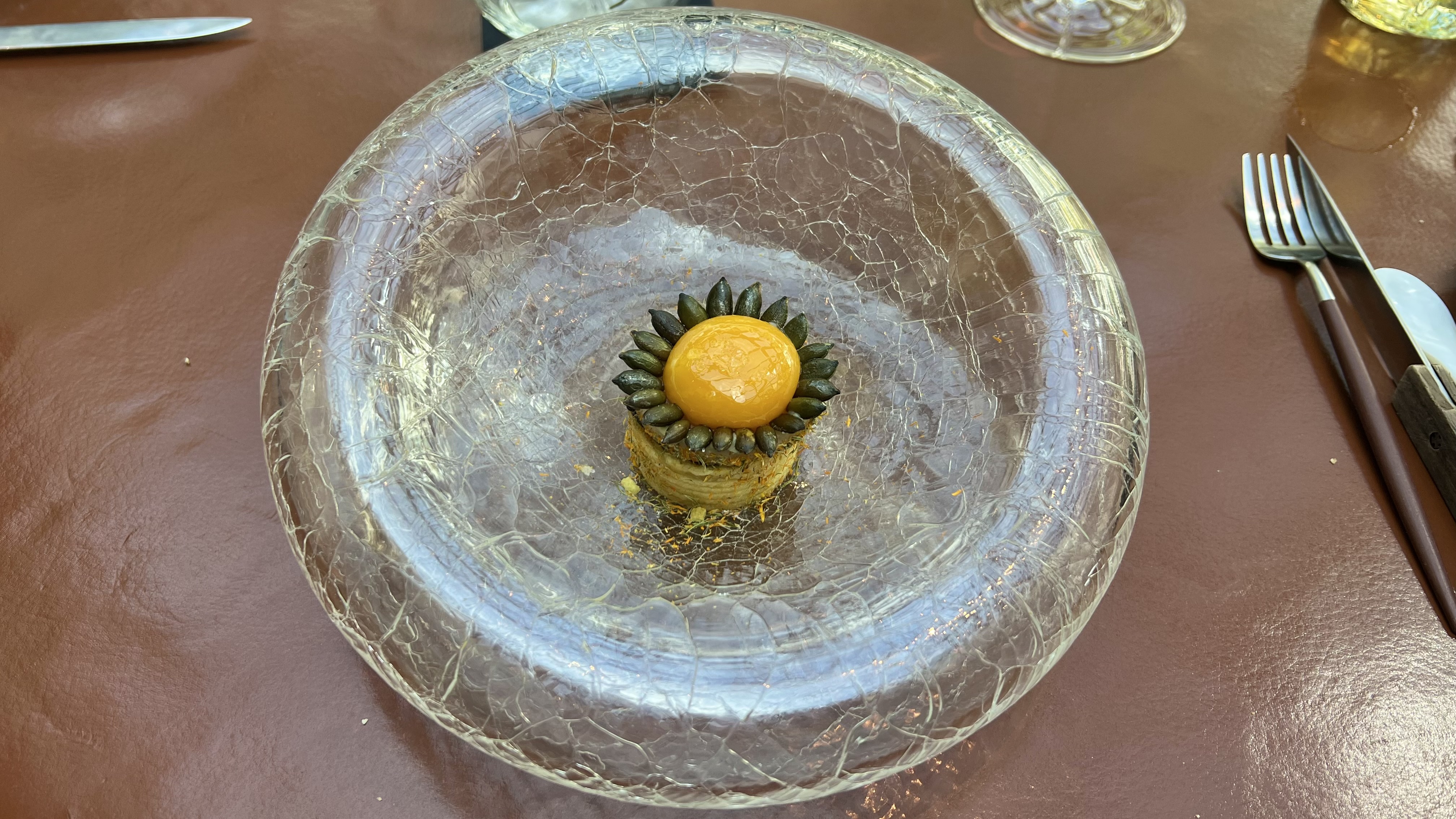 The bonus dish was caviar with an egg yolk, pastry, and sunflower seeds. The sunflower seeds were arranged as petals, and so it looked like a reverse sunflower. This dish was a great combination of contrasting textures and flavors, and a great pairing with the vodka.
