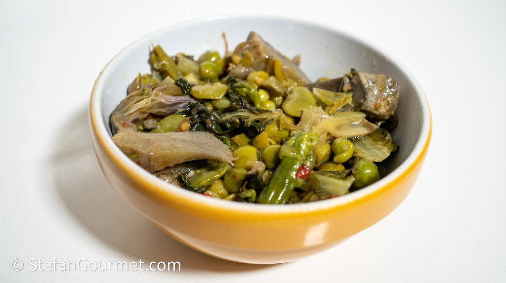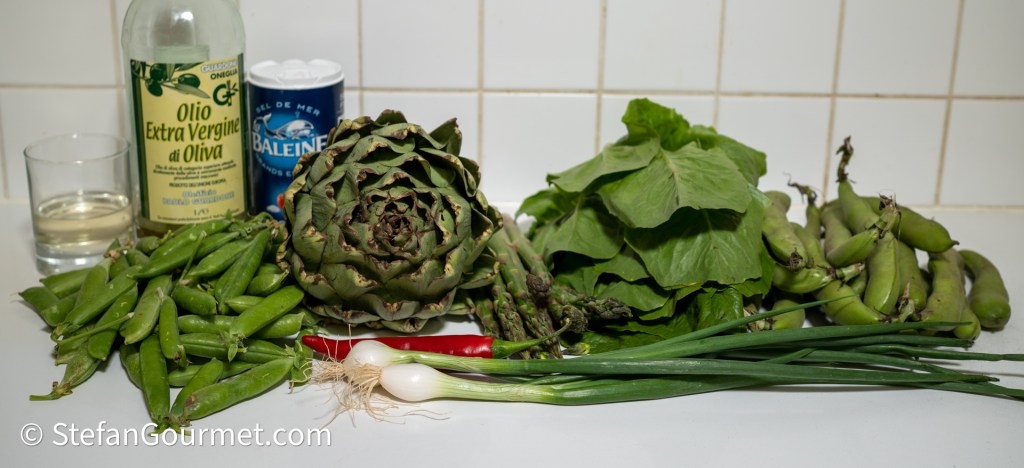 Vignarola is a stew of the vegetables that grow around Rome at the end of Spring, beginning of Summer. I was reminded of this dish by Jo’s Frascati Cooking That’s Amore. Vignarola can be a contorno (side dish), minestra (hearty soup, with spelt and orzo) or served with pasta like Jo did in her Lasagna Vignarola. The dish can be enriched with guanciale, pancetta, or salsiccia, but I’m keeping it vegan here. Typical vegetables are peas, fava beans, artichokes, asparagus, and Romaine lettuce, but at least three of them would do. The vegetables are supposed to be cooked al dente, so not raw and not mushy.