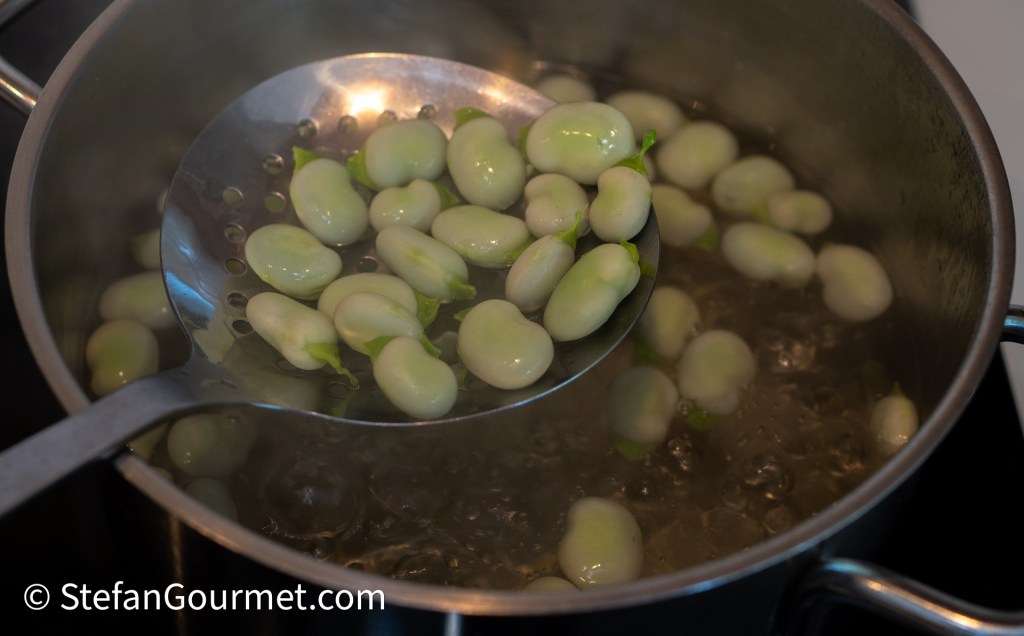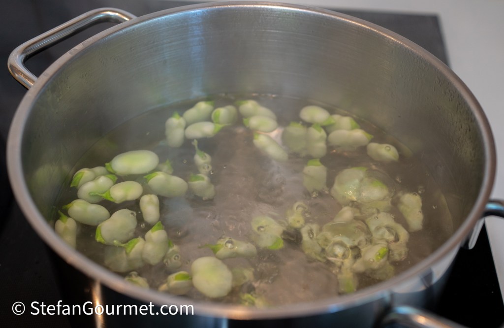 Parboil the fava beans 2 minutes in boiling water.
