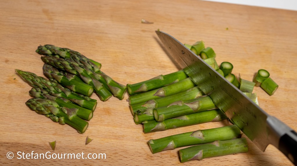 Remove the tough fibrous end of the asparagus and discard. Cut off the tops and chop the stalks.