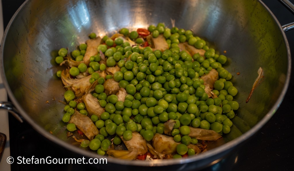 Then add the peas and stir for another 4 minutes. If you did not skin the fava beans, you should add them now too.