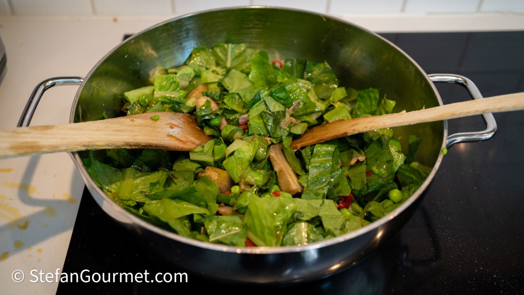 Add the romaine lettuce and the shelled fava beans.