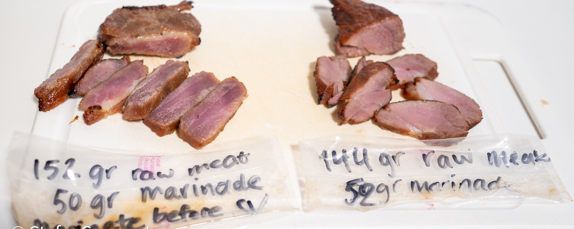 I weighed both pieces of pork accurately and used 50 grams of marinade for each piece. The first piece I vacuum sealed with the marinade and then allowed to marinate for 24 hours in the refrigerator before sous vide cooking. The second pieces I stored in the refrigerator during those 24 hours, and then vacuum sealed it with the marinade just before cooking both pieces sous vide for 24 hours at 57C/135F.
