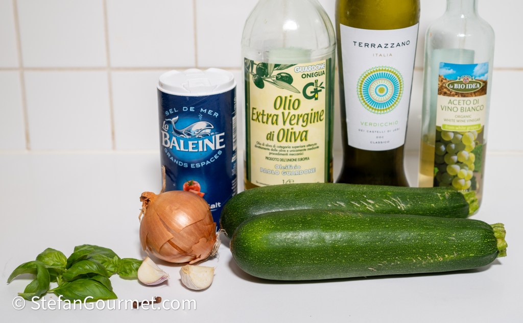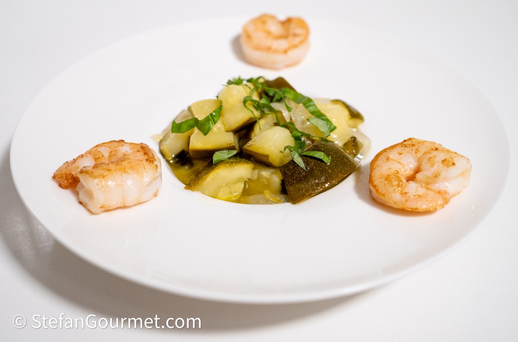 This is a very simple recipe that I found in the Italian book “Le ricette di Osterie d’Italia”. The zucchini are boiled in the marinade and then left to cool. It can served as part of a spread of antipasti, or as a contorno (side dish). I wasn’t doing a whole antipasti spread, but added some quick pan-fried shrimp to serve as antipasti. This is one of those recipes that is better the next day after it has spent a night in the refrigerator.
