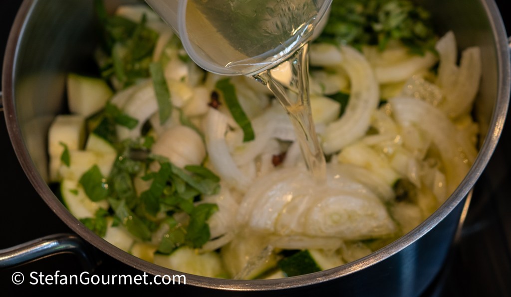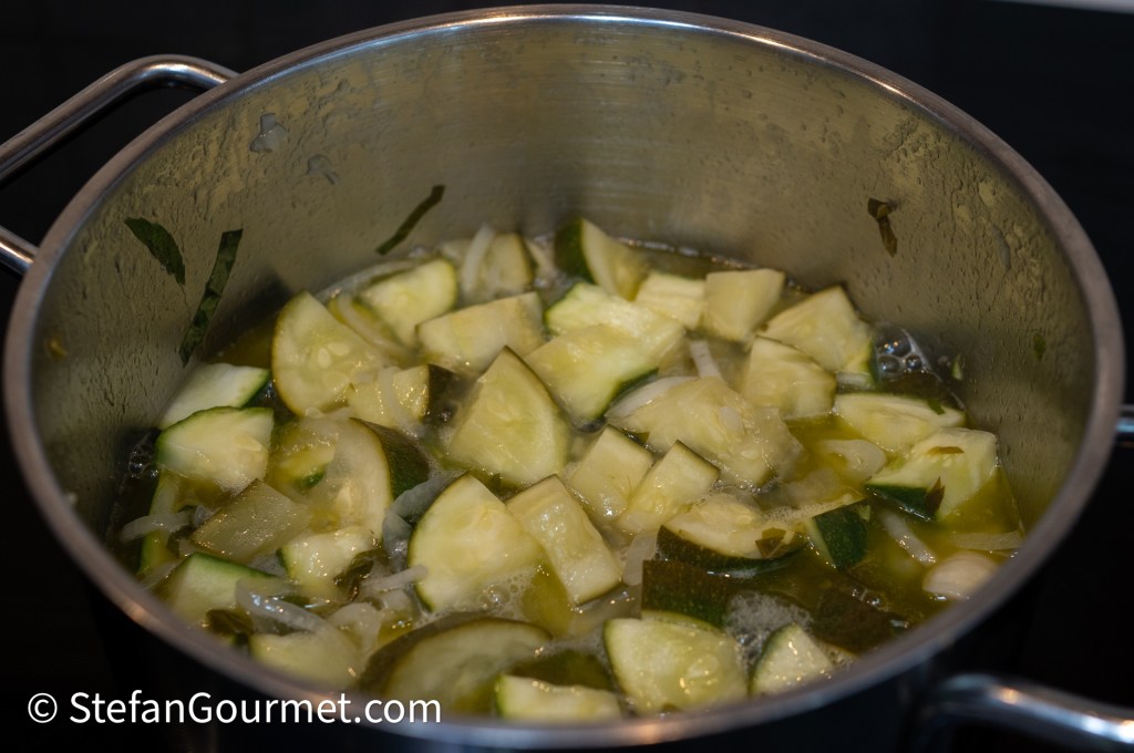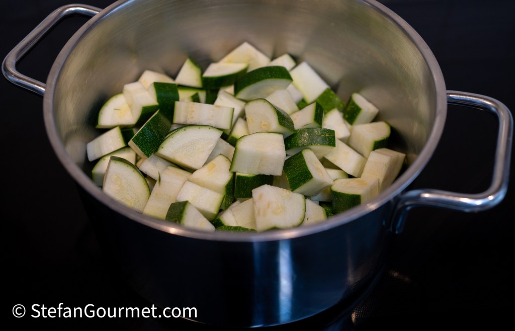 Cut the ends off the zucchini and discard. Chop the zucchini into bite-size pieces, and place them in a pot.