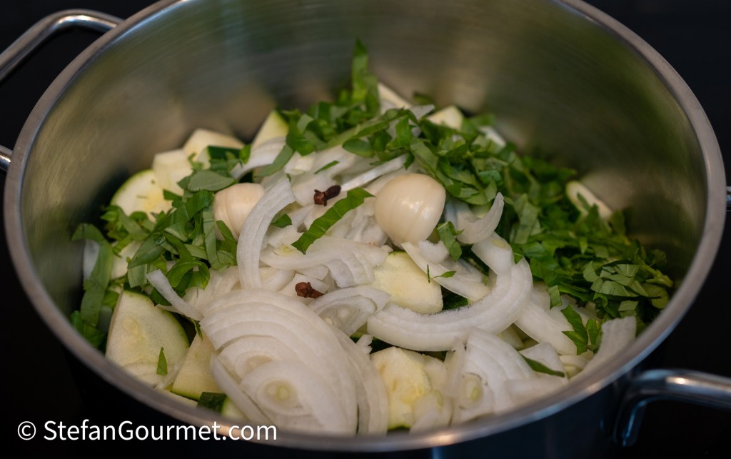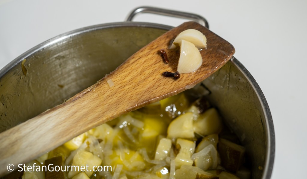 Remove the cloves and garlic (if left whole) before serving, but leave them in if you are going to store the zucchini in the refrigerator so they can provide more flavor.