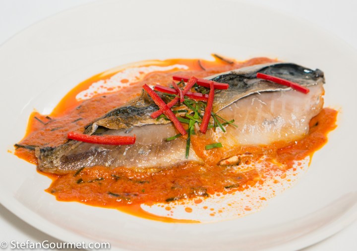 Choo chee, seafood (in this case mackerel) in a sauce of coconut milk and red curry paste, is one of my favorite Thai dishes.