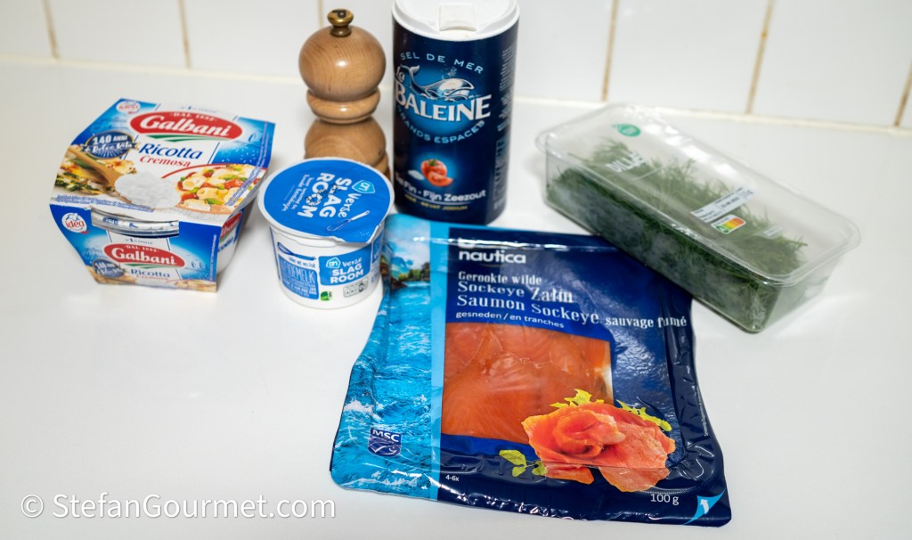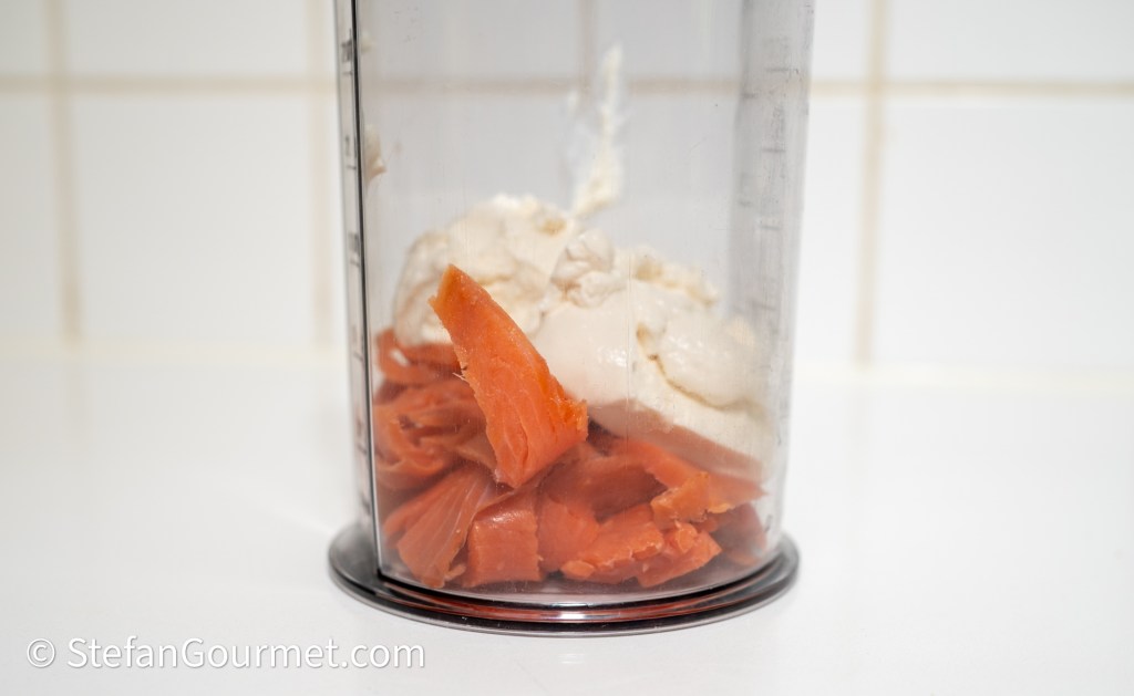 Roughly chop the smoked salmon, and place it in a blender jar together with the ricotta.