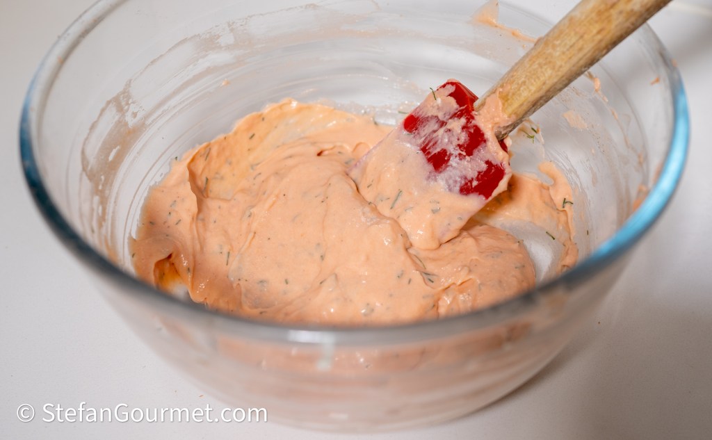 Then fold in 1/2 tablespoon of minced dill (stems removed first).