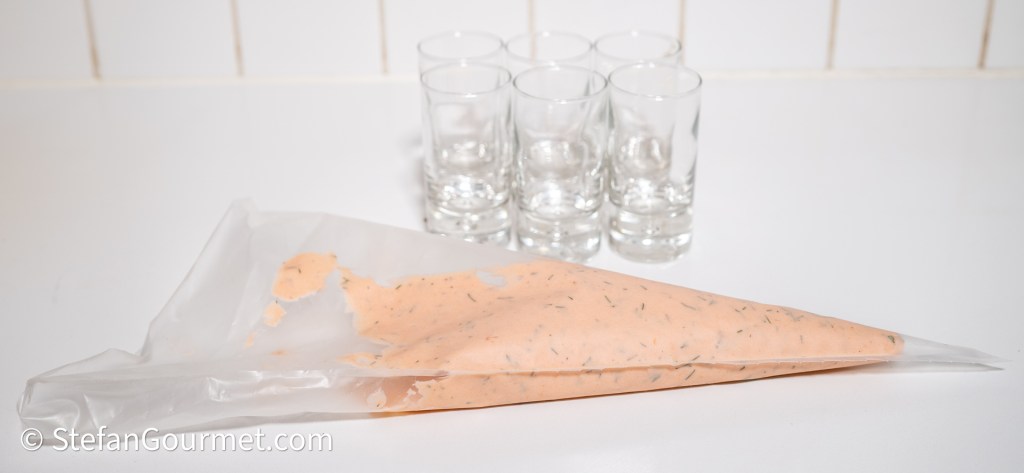 A piping bag is a handy way to neatly dispense the salmon mousse into serving glasses, or on toast.